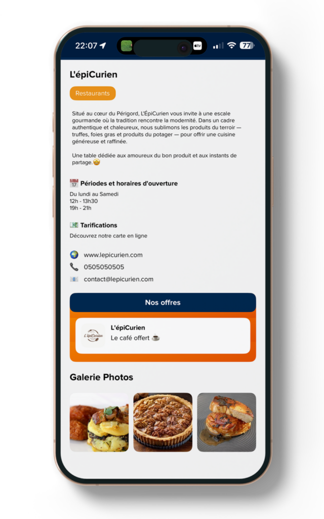 Chaque partenaire dispose d'une fiche détaillée avec description, horaires, coordonnées et itinéraire. Vos hôtes ont tout ce qu'il faut pour découvrir vos recommandations sans friction ni recherche supplémentaire.