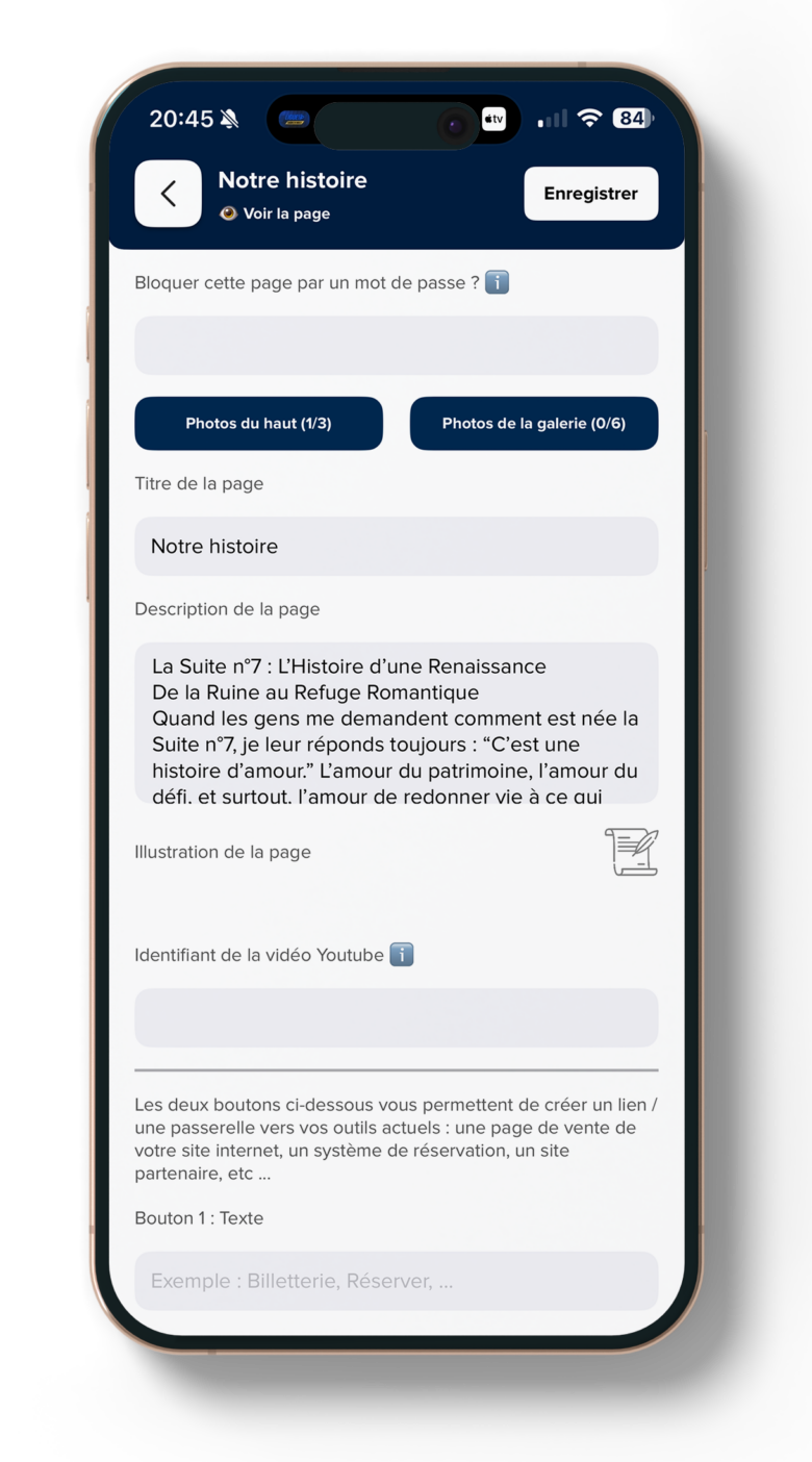 La fonctionnalité Présentation libre de La Clé vous offre une toile vierge pour exprimer l’essence de votre établissement. Fini les formats rigides et les templates impersonnels : vous disposez d’un espace totalement modulable pour partager votre vision, vos valeurs et ce qui rend votre hébergement unique. Créez un contenu riche, personnalisé et captivant qui reflète fidèlement votre identité.